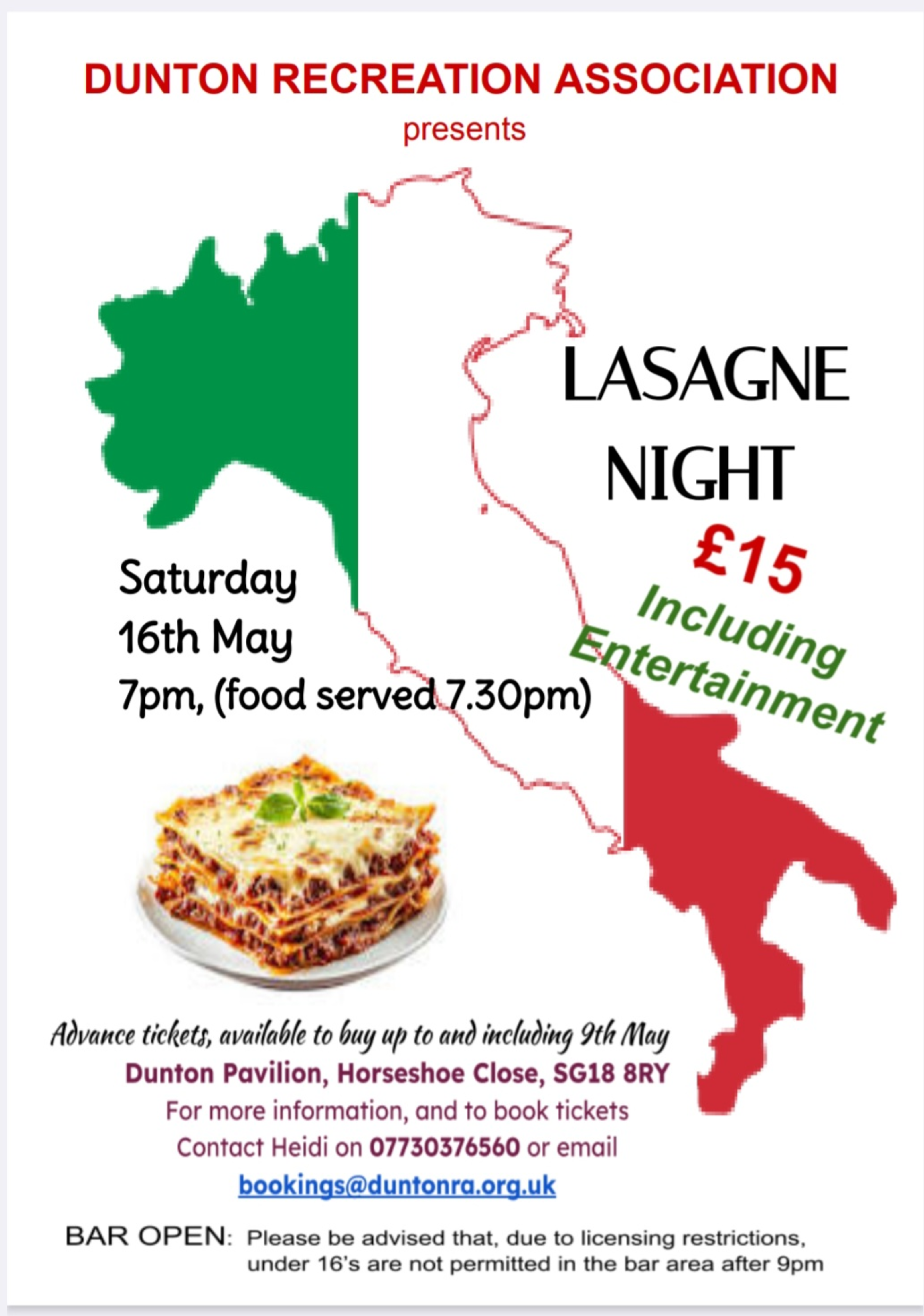 Saturday May 16; 7pm - Lasagne Night with Entertainment and a Licensed Bar.